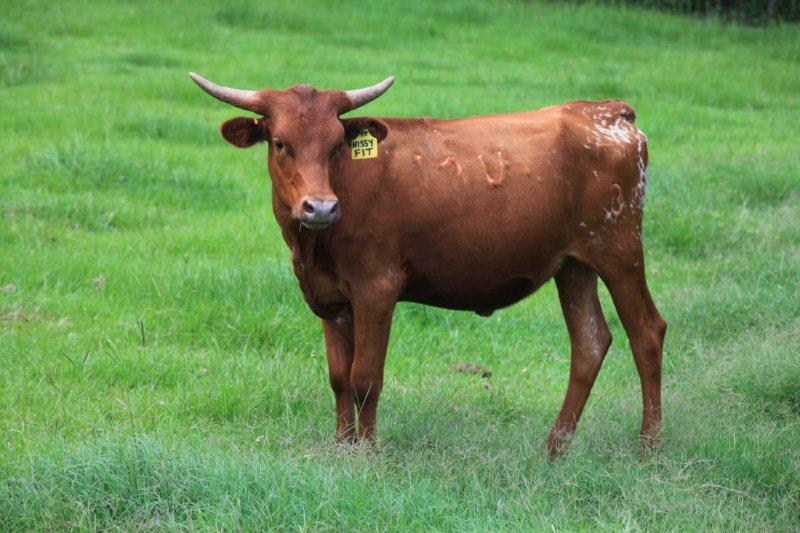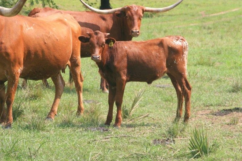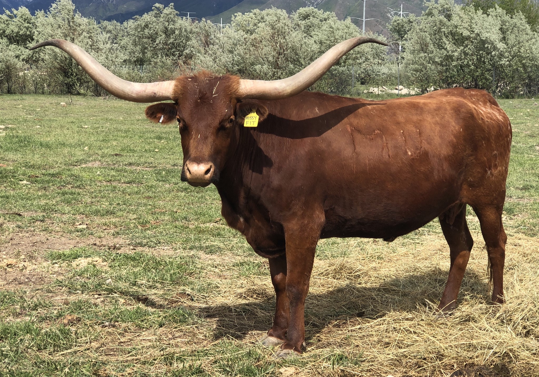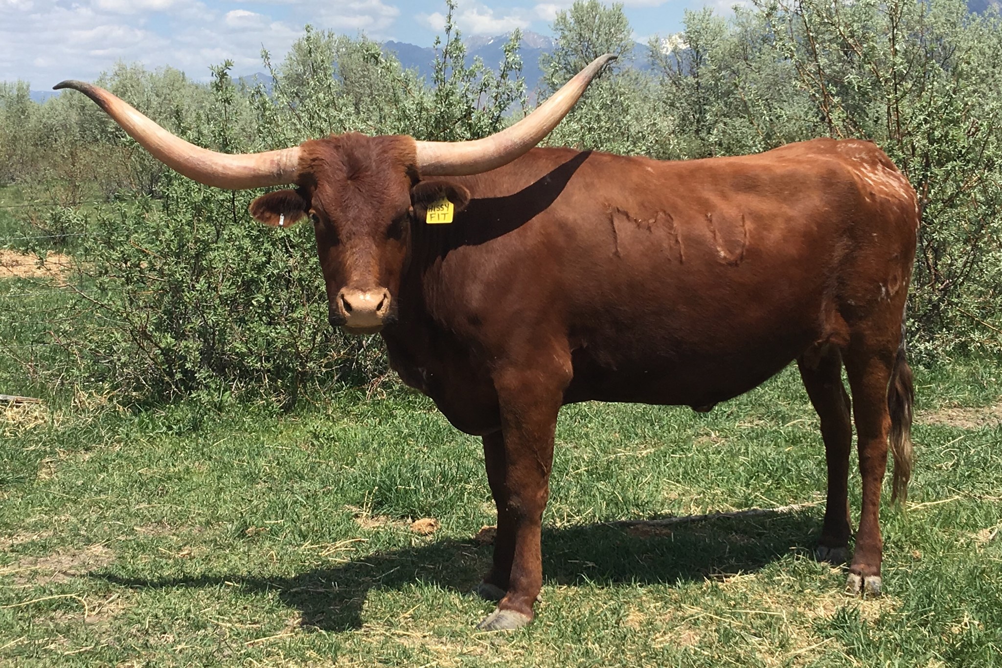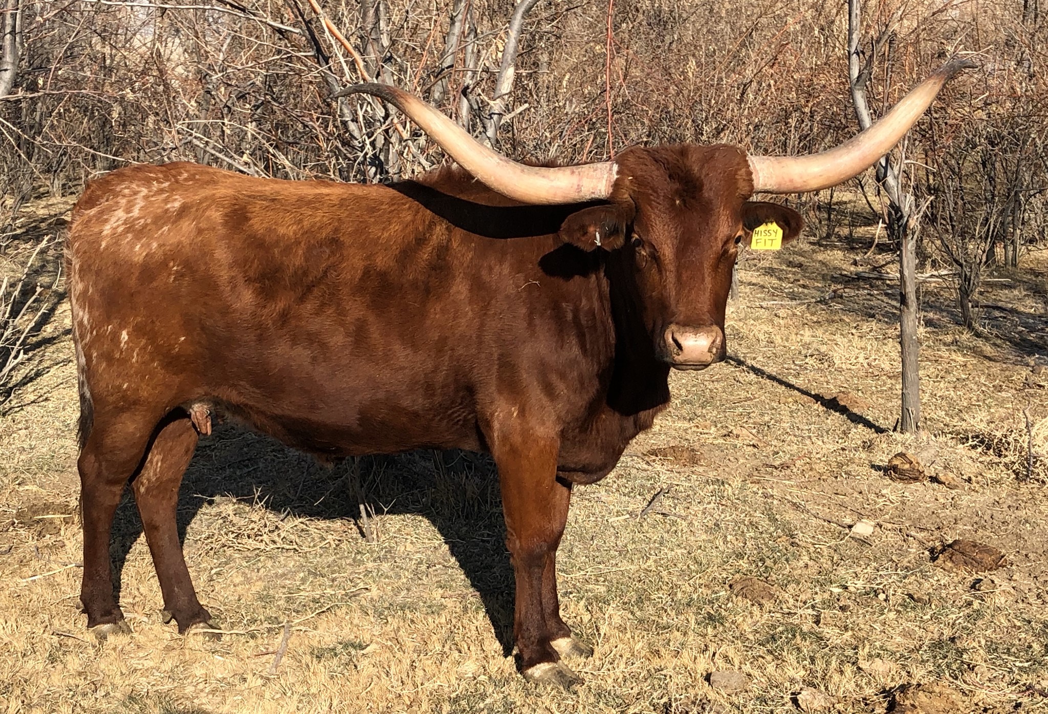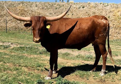 Purchased from the outstanding herd of Stockton-Burton at the Marquess Arrow Ranch production sale. She has huge horn base that are really heading backwards. We are excited to cross her genetics into our herd. Heifer calf by PCC Front Runner.